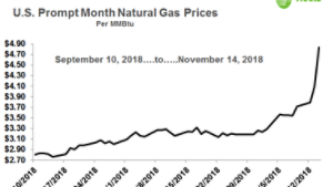 Closing Wednesday at $4.84 per MMBtu, prompt-month natural gas prices have soared to their highest levels since 2014. Despite the multi-year high levels, this move wasn’t totally unexpected and Trane has been warning clients about the possibility of a winter price run-up since signs started pointing that direction in the summer months.